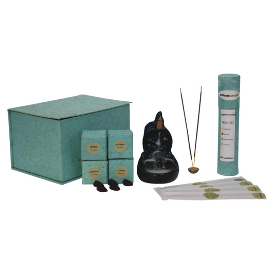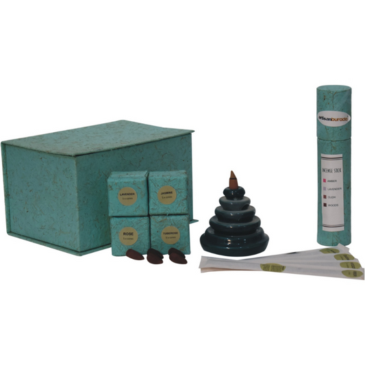 Temple Back Flow Burner Fountain Set - Cone Fragrances: Amber, Lavender, Oudh & Woods, Insence Fragrances: Mango, Apple, Pineapple & Orange